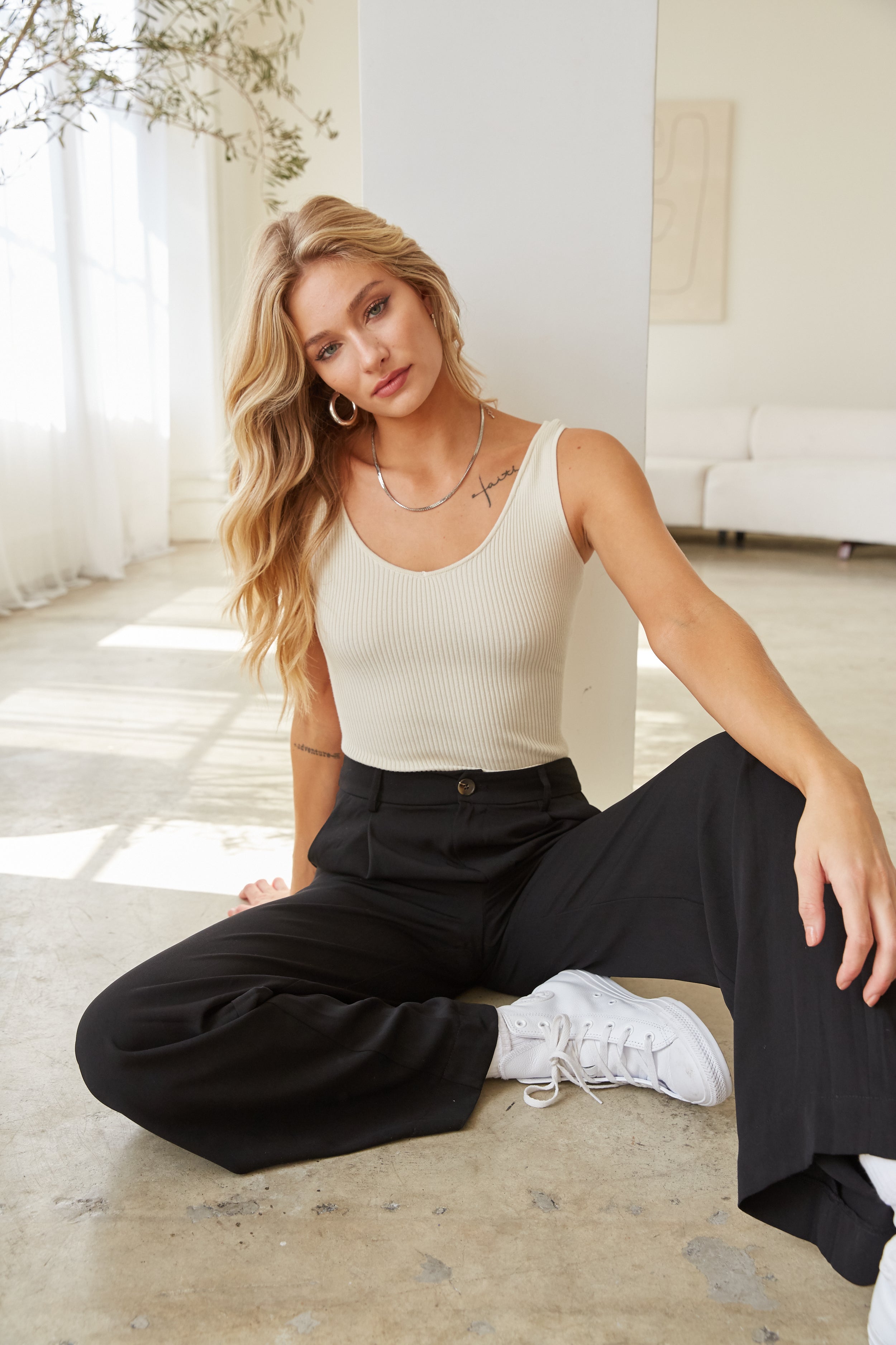 Hey babe, the Addison Ribbed Bodysuit is the perfect layering piece! This bodysuit is complete with a soft knit ribbed design, scoop neckline, and thick straps. Pair this bodysuit with some for a sleek look!