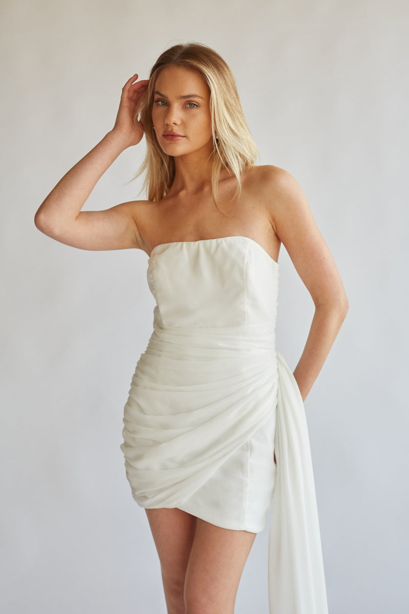Turn heads in the Ariana Strapless Draped Mini Dress! This beautiful mini dress features a strapless sweetheart neckline, ruched bodycon silhouette, and a cascading drape detail. Pair with a chic for your next special occasion!