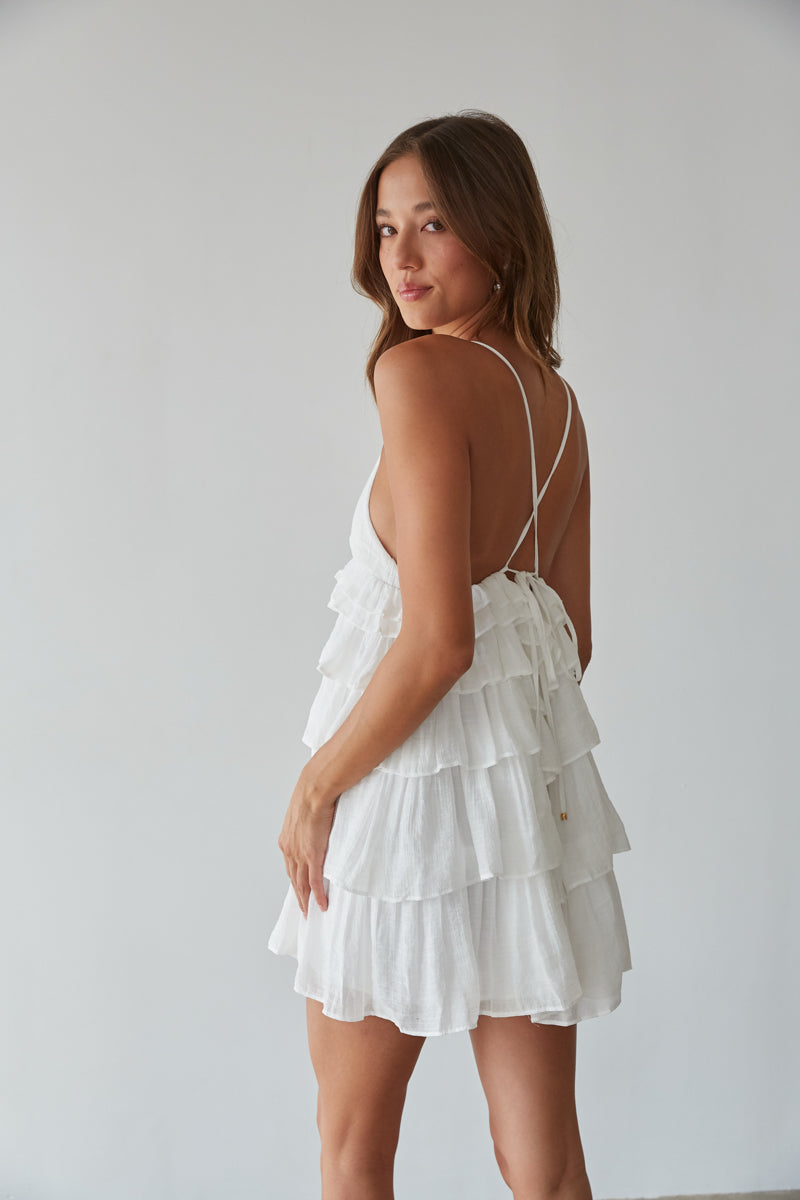 Get ready for sunshine and good times in the Boardwalk Tiered Ruffle Tie Back Mini Dress! This adorable mini dress features a V-neckline, tiered ruffles, and an open adjustable tie back. Available in white and turquoise. Pair with some cute to complete the look!