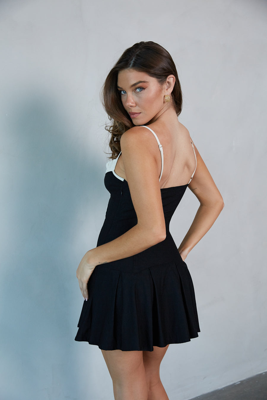 Oh so coquette, the Claire Contrast Coquette Pleated Mini Dress is uniquely charming for Holiday Season! This piece features a flattering fit and flare silhouette, contrast color way, and delicate lace details. Available in Black + White Contrast; style with a chic pair of to complete the look!