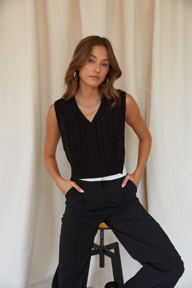 Look chic and sophisticated in the Connie Cropped Cable Knit Sweater Vest! This sleeveless knit top features a deep V-neckline and small side slits. Pair this trendy sweater vest with the for an elevated trendy look!