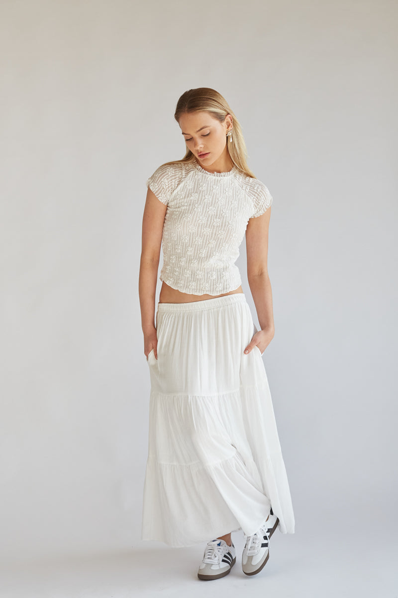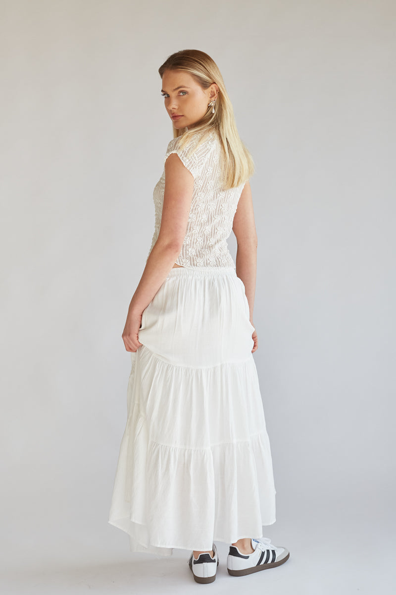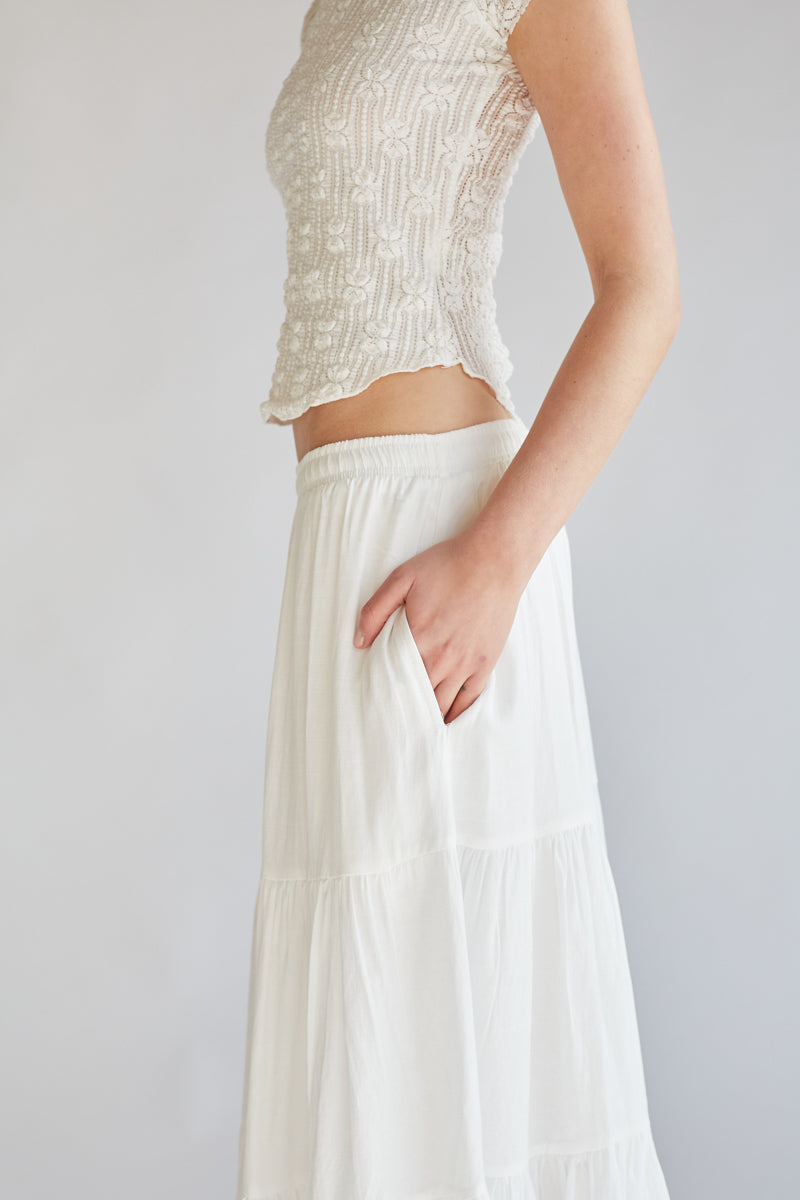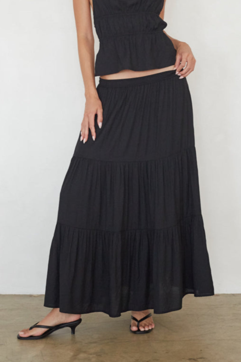 Create a vacay worthy look with the Hope Tiered Maxi Skirt! This breezy skirt features a low banded waist, flowy tiered skirt, side pockets, and ends at a maxi length.